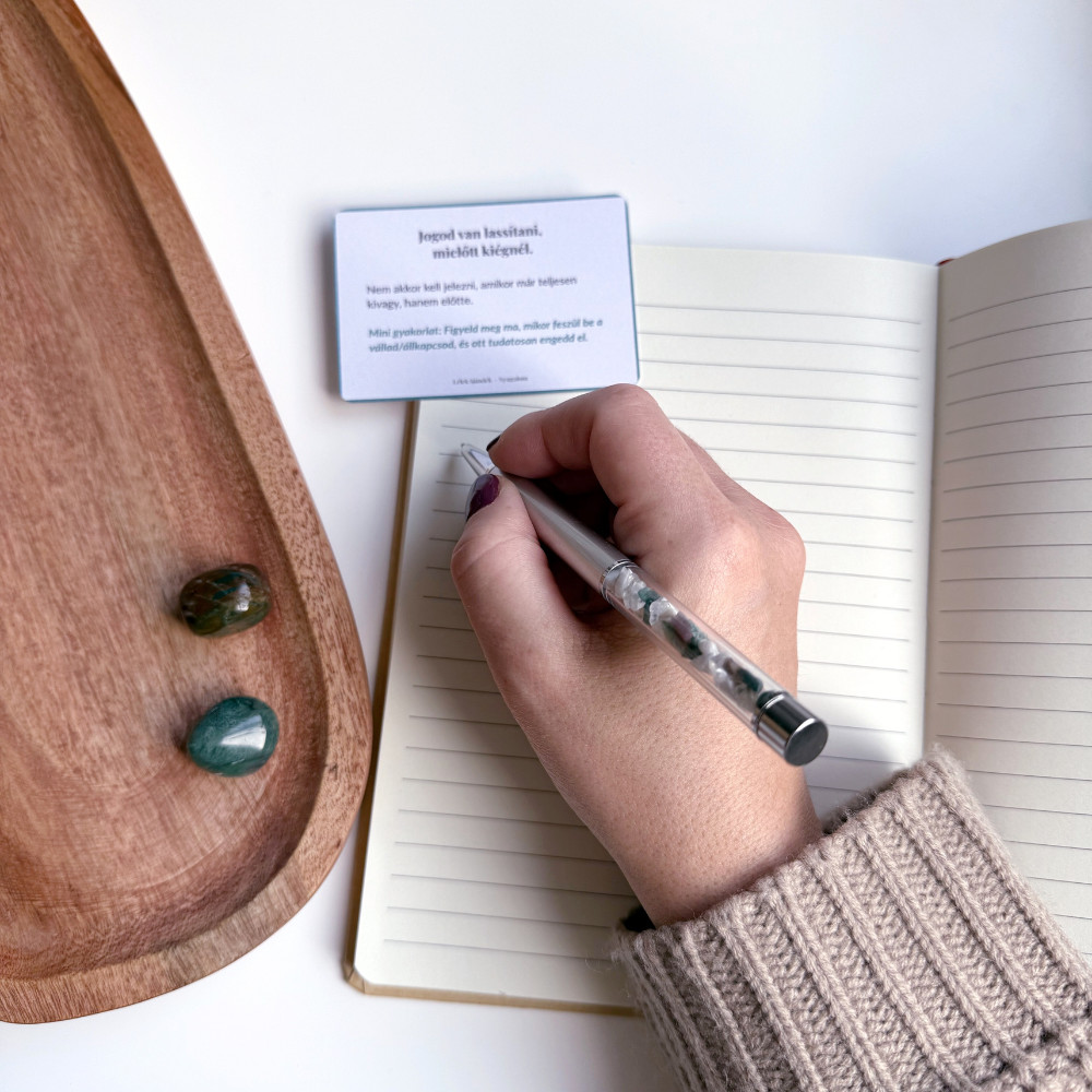 Fontos: A Férfi Nyugalom ásvány toll nem helyettesíti a terápiát, pszichológusi vagy orvosi segítséget, és nem ígér gyógyulást, „blokkok oldását” vagy csodamegoldást. Abban segít, hogy legyen egy kézben tartható eszközöd, amivel meg tudod írni magadnak, mi van benned, és legyen egy csendes emlékeztetőd: „Megengedhetem magamnak, hogy néha lelassítsak.”