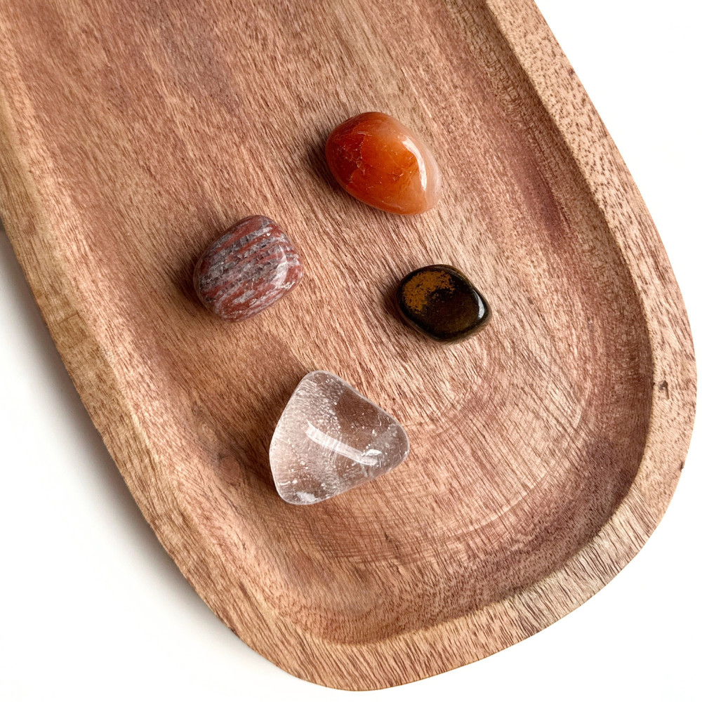 A szett 4 marokkövet tartalmaz: vörös jáspis, hegyikristály, karneol, tigrisszem