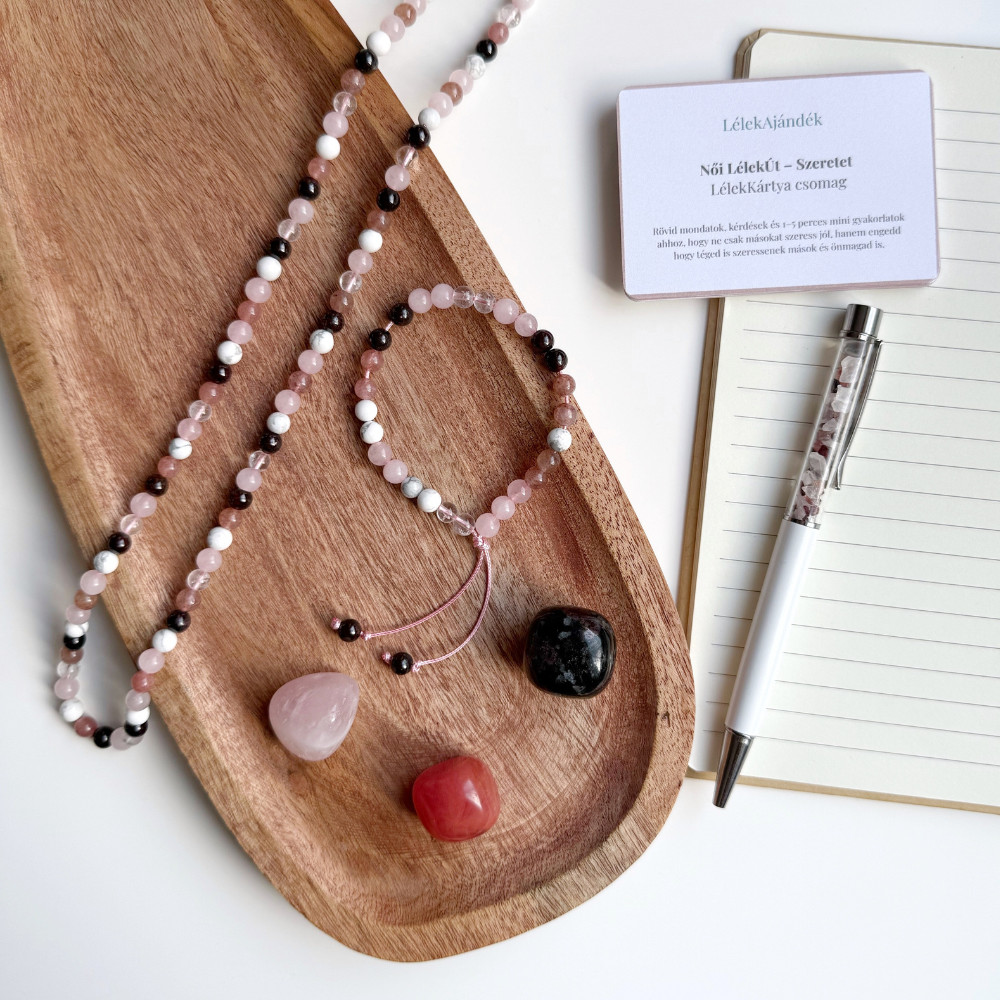 Fontos megjegyzés: A Prémium Boxban található eszközök – a nyaklánc, Léleklánc, marokkövek, ásványtoll és LélekKártyák – nem helyettesítik a terápiát, pszichológusi vagy orvosi segítséget, és nem ígérnek gyógyulást vagy „blokkok oldását”.