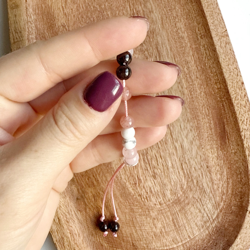 Eperkvarc, gránát, hegyikristály, howlit és rózsakvarc ásványokkal, rózsaszín fonalon, tudatos, ismétlődő mintázatban.