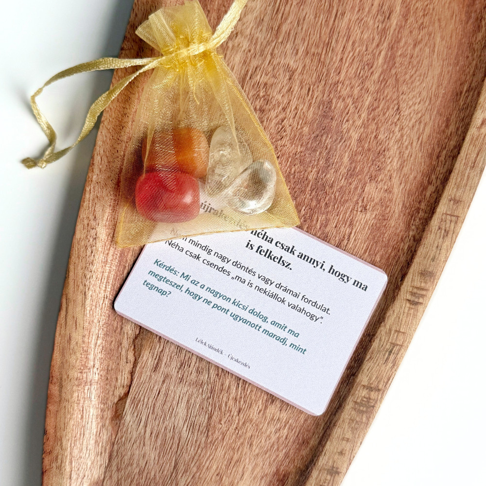 Minden Női Újrakezdés marokkő csomag mellé jár egy ajándék LélekKártya, egy mintalap a későbbi Újrakezdés kártyacsomagból.